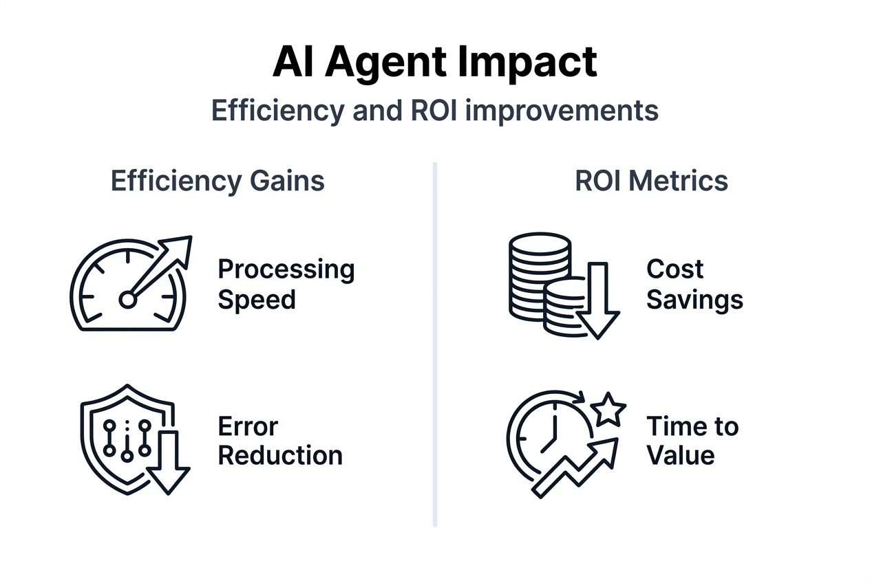 AI agents deliver 30-40% operational efficiency improvements through faster processing, reduced errors, and lower costs per transaction. They handle high-volume repetitive tasks 24/7, freeing human employees for strategic work requiring judgment and creativity. Enterprises typically realize ROI within 12-18 months through cost savings and productivity gains. Additional benefits include improved customer satisfaction from faster response times and scalability during peak periods without proportional cost increases.